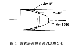 不同流動狀態(tài)的水泥漿液流經(jīng)流量計測量管時,管內圓截面上會呈現(xiàn)不同的流速分布(見圖1),即: 層流的流速變化是拋物線分布,在管中心軸上流速*大,且雷諾數(shù)變化、流速分布形態(tài)不變;紊流時,流速分布在測量管內壁的近旁比層流流速大,在中心部比層流時流速小,且流速分布形態(tài)隨雷諾數(shù)的變化而變化。