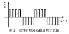 常規(guī)電磁流量計(jì)所應(yīng)用的低頻方波勵(lì)磁方式的勵(lì)磁電流頻率通常為工頻的1/4~1/10。目前深井(6000m以上)的固井施工中所使用泥漿的密度大多在1.8g/cm³以上,流速高達(dá)25m/s,所用的泥漿又是固液兩相低導(dǎo)率流體,雖然高壓下能消除非牛頓流體所帶來的測(cè)量誤差,但測(cè)量管內(nèi)會(huì)產(chǎn)生隨流量增加而頻率增加的隨機(jī)干擾噪聲。經(jīng)測(cè)定,在DN50測(cè)量管內(nèi),所用的泥漿密度為2.0g/cm³,流速在10~15m/s范圍內(nèi),測(cè)量管內(nèi)的流動(dòng)噪聲主要為尖峰狀的泥漿流噪聲,量級(jí)在mv級(jí),頻率集中在25Hz以下,如圖1所示。在勵(lì)磁頻率較低時(shí),泥漿干擾的數(shù)量級(jí)較大,高頻時(shí)干擾數(shù)量級(jí)較小,具有1/f的頻譜特性。另外,施工現(xiàn)場(chǎng)敲擊和震動(dòng)所帶來的低頻噪聲,也會(huì)影響電磁流量計(jì)的計(jì)量精度。提高勵(lì)磁電流頻率可以規(guī)避和抑止這些干擾,以提高電磁流量傳感器輸出的信噪比,但會(huì)犧牲電磁流量計(jì)的零點(diǎn)穩(wěn)定性。本文提出新的一種勵(lì)磁方式,采用雙頻矩形波作為勵(lì)磁信號(hào)。其勵(lì)磁電流波形是在低頻矩形波上疊加高頻矩形波,用兩種采樣頻率分別得到高頻和低頻兩種流量信號(hào)。如圖2所示,高頻部分是80Hz的矩形波,外包絡(luò)線是10Hz的低頻矩形波。這樣,能克服單一低頻矩形波勵(lì)磁存在的泥漿流動(dòng)噪聲,同時(shí)又能保證零點(diǎn)的穩(wěn)定性,提高流量計(jì)的計(jì)量穩(wěn)定性和響應(yīng)速度。