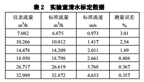 現(xiàn)場(chǎng)試驗(yàn)所用測(cè)量管的內(nèi)徑為DN50,通過高壓由壬接入泥漿管線,并串接渦輪流量計(jì)進(jìn)行比較,采用標(biāo)準(zhǔn)計(jì)量罐測(cè)試。計(jì)量鉆井泥漿密度范圍為1.15g/cm³~2.50g/cm³,固井設(shè)計(jì)施工現(xiàn)場(chǎng)一次性替漿量為18m³~160m³,替漿瞬時(shí)流量為0.2m³/min~2.8m³/min(流速:1.6~23.8m/s);通過近15口井的施工應(yīng)用,結(jié)果如表1所示。試驗(yàn)表明儀表計(jì)量誤差小于1%;在流速2.0m/s以下,隨著流量的減少測(cè)試誤差逐漸提高,在流速1.0m/s左右計(jì)量精度降到3%左右。經(jīng)分析,主要是由零點(diǎn)漂移引起的,這點(diǎn)與實(shí)驗(yàn)室用清水標(biāo)定結(jié)果基本吻合。使用DN50的測(cè)量管,實(shí)驗(yàn)室標(biāo)定結(jié)果如表2所示。試驗(yàn)證明,采用雙頻矩形波作為勵(lì)磁信號(hào),可有效地規(guī)避和抑止固井泥漿的流動(dòng)噪聲和現(xiàn)場(chǎng)震動(dòng)等所帶來的低頻噪聲,從而顯著提高儀表計(jì)量泥漿的精度。