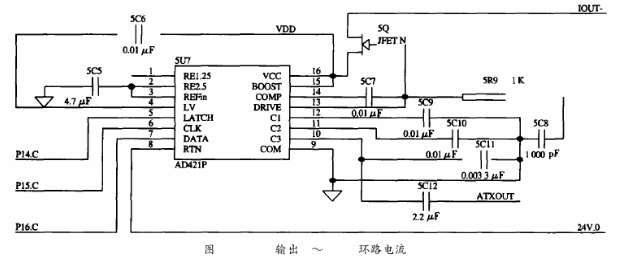 HT2012需要外部提供460.8kHz的時鐘信號,且要求時鐘頻率的誤差是0.1%,若直接入一個460.8kHz的晶振不僅會引起系統(tǒng)功耗的增加,而且該晶振屬于非標(biāo)準(zhǔn)晶振,需專門定制。為了解決這一問題,在系統(tǒng)中采用一片1.8432MHz的晶振以產(chǎn)生時鐘信號,再經(jīng)分頻器CD4013進行4分頗,可輸出1.8432MHz/4=460.8kHz的分頻信號供HT2012使用。AD421其內(nèi)部的電壓調(diào)節(jié)器與外部的場效應(yīng)管DN25D對輸入到AD421的電壓進行調(diào)整,可提供+3.3V電壓作為其他設(shè)備的電源。HART發(fā)出的FSK信號,經(jīng)過一個電容耦合送到AD421中,轉(zhuǎn)換成相應(yīng)的0.5mA正弦電流信號,實現(xiàn)電壓信號到電流信號的轉(zhuǎn)換,同時,疊加在4~20mA的電流上送給接收設(shè)備,實現(xiàn)了HART協(xié)議的信息的交換。本電路耦合電容取為0.0033μF,如圖5所示。