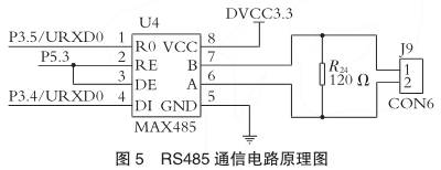 RS485接口組成半雙工網(wǎng)絡(luò),選擇兩線制與上位機(jī)電腦相連,采用屏蔽雙絞線傳輸。通信系統(tǒng)整體為總線式結(jié)構(gòu),這樣1臺(tái)上位機(jī)*多可以和現(xiàn)場(chǎng)32臺(tái)智能儀表相連。采用MAX485芯片完成電壓轉(zhuǎn)換,圖5為RS485通信電路原理圖。