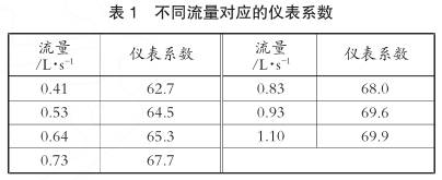 其中自變量為流量,因變量為儀表系數(shù)。當(dāng)流量介于0.4~1L/s時,采用式(1)進(jìn)行計(jì)算;當(dāng)流量超過1.1L/s時,保持儀表系數(shù)恒為69.9。