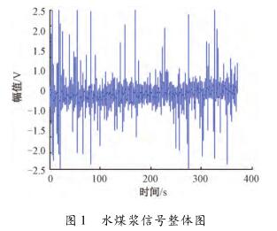 針對(duì)出水流量計(jì)測(cè)量水煤漿時(shí)出現(xiàn)較大波動(dòng),甚至回零這一問(wèn)題,特去某煤化工企業(yè)甲醇分公司進(jìn)行現(xiàn)場(chǎng)數(shù)據(jù)采集。該公司所使用的對(duì)置式四噴嘴氣化有4個(gè)噴嘴,噴嘴管道口徑為125mm,管中水煤漿流量基本穩(wěn)定在19m³/h(流速約為0.48m/s)。每條噴嘴煤漿線(xiàn)上安裝了3臺(tái)出水流量計(jì),每臺(tái)出水流量計(jì)由傳感器和變送器兩部分組成。選擇其中1條水煤漿管線(xiàn)上的1臺(tái)出水流量計(jì)進(jìn)行數(shù)據(jù)采集,因?yàn)樵撆_(tái)出水流量計(jì)測(cè)量結(jié)果波動(dòng)大,甚至出現(xiàn)回零的現(xiàn)象。將課題組研制的基于DSP的電磁流量變送器的信號(hào)線(xiàn)和勵(lì)磁線(xiàn)接到該電磁流量傳感器的電極和勵(lì)磁線(xiàn)圈上,組合成完整的出水流量計(jì),進(jìn)行水煤漿數(shù)據(jù)采集。使用的電磁流量變送器是以TI公司DSP芯片TMS320F28335為核心,采用高頻勵(lì)磁方案,其硬件主要包括勵(lì)磁控制系統(tǒng)和信號(hào)采集處理系統(tǒng),具體的模塊有勵(lì)磁驅(qū)動(dòng)模塊、信號(hào)調(diào)理采集模塊、信號(hào)處理控制模塊、人機(jī)接口模塊、通信模塊及電源管理模塊。信號(hào)調(diào)理采集模塊中的調(diào)理電路對(duì)一次儀表輸出的信號(hào)進(jìn)行放大和濾波,截止頻率是2kHz,放大倍數(shù)約為230倍。通過(guò)NI公司USB-6216型號(hào)的數(shù)據(jù)采集卡進(jìn)行數(shù)據(jù)采集,把調(diào)理電路的輸出端連接到數(shù)據(jù)采集卡的一個(gè)差分輸入端,并設(shè)置數(shù)據(jù)采集卡工作在差分的測(cè)量模式,設(shè)置采集卡的采樣頻率為10kHz。采集多組水煤漿信號(hào)數(shù)據(jù),每組數(shù)據(jù)的時(shí)間長(zhǎng)度為5min。