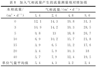 利用清水中渦輪的刻度方程計(jì)算加入不同氣體流量后渦輪響應(yīng)頻率所對(duì)應(yīng)的流量,即為加入氣體后的測(cè)量流量,再用所得測(cè)量流量減去配比的標(biāo)準(zhǔn)水流量,得到氣相加入后測(cè)量的絕對(duì)增加值,即加入氣相流量產(chǎn)生的測(cè)量誤差(見表1)。計(jì)算結(jié)果表明,加入氣體流量后,渦輪的測(cè)量流量明顯增加,尤其是液相流量較低時(shí),增加的測(cè)量流量更高,氣體對(duì)流量測(cè)量產(chǎn)生了較大的測(cè)量誤差。低氣量下,平均1m3/d的氣量產(chǎn)生的測(cè)量誤差大約相當(dāng)于5m3/d(絕對(duì)增加值)。