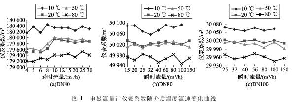 將實(shí)驗(yàn)測(cè)得的dn150深井水流量計(jì)在不同溫度及流速下的儀表系數(shù)數(shù)據(jù)整理,特性曲線如圖1所示,3組曲線分別對(duì)應(yīng)DN40、DN80、DN100的3塊dn150深井水流量計(jì)的儀表系數(shù)曲線。
