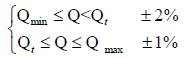 由圖2 可見,儀表系數(shù)可分為二段,即線性段和非線性段。在非線性段, 實際特性受軸承摩擦力、流體粘性阻力影響較大。當流量低于Qmin 時,儀表系數(shù)隨著流量迅速變化。壓力損失與流量的平方成正比關(guān)系。通常線性段約為工作段的2/3,其特性與渦輪結(jié)構(gòu)參數(shù)及流體粘性有關(guān)。隨流量的變化其儀表系數(shù)K 也會有一定的變化,但變化不大,通常將其變化幅度稱為流量計的計量準確度。對于產(chǎn)品設計而言,期望能將線性段的流量范圍拓展,一臺流量計能覆蓋同口徑的不同流量范圍,使得產(chǎn)品量程比變寬從而降低生產(chǎn)管理與生產(chǎn)批量加工成本。對于1.0 級的高壓機油流量計,以Qt(0.2Qmax)為分界流量點,將計量線性分為兩段,其中一段的*大允許誤差為±2%,而另一段的*大允許誤差為±1% 。按圖2 所示,通常每臺渦輪流量計均有較為相似特性曲線,若將可測量流量范圍做寬,就能在同口徑不同流量范圍進行分段截取,以實現(xiàn)一臺流量計能覆蓋同口徑的不同流量范圍。