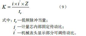 根據(jù)實際流量計的所測得儀表系數(shù)K 更換對應齒輪傳動比,使機械表頭顯示部分和齒輪轉(zhuǎn)動發(fā)出低頻脈沖輸出均與高頻脈沖輸出匹配,實際三者關(guān)系如下: