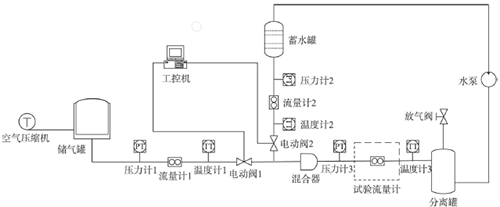 空氣壓縮機(jī)將空氣壓縮后送入儲氣罐,標(biāo)準(zhǔn)流量計(jì)1計(jì)量氣液混合前儲氣罐送入管道的氣體流量。蓄水罐距離地面30m,提供試驗(yàn)所需的液相,其流量由標(biāo)準(zhǔn)流量計(jì)2測得。液相和氣相經(jīng)混和器混和后送入試驗(yàn)管段,*后流入分離罐將水和空氣進(jìn)行分離,空氣由放氣閥排出,水由水泵送回蓄水罐循環(huán)使用。工控機(jī)對所有儀表數(shù)據(jù)進(jìn)行采集和顯示并對兩個電動調(diào)節(jié)閥進(jìn)行控制,調(diào)節(jié)氣相和液相的流量。