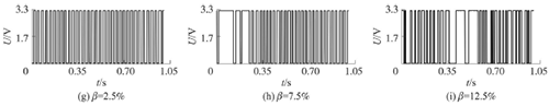 試驗(yàn)發(fā)現(xiàn),氣相的加入對過熱蒸汽流量計(jì)測量的影響顯著,譜分析和脈沖計(jì)數(shù)兩種方法隨著氣相注入的增加其表現(xiàn)也不同。圖4反映了水流量12m3/h時,注入不同氣含率β時A點(diǎn)的模擬信號,如圖4(a~c)所示;經(jīng)譜分析后得到的頻率值,如圖4(d~f)所示;用脈沖計(jì)數(shù)方法得到的脈沖信號,如圖4(g~i)所示。圖4顯示,當(dāng)注入氣量不大時,對過熱蒸汽流量計(jì)的影響不大,無論是譜分析結(jié)果還是脈沖計(jì)數(shù)得到的結(jié)果都比較好。當(dāng)注入的氣量進(jìn)一步增加時,渦街原始信號強(qiáng)度和穩(wěn)定性逐漸變差,渦街頻率信號會被干擾信號所淹沒,反映到譜分析圖是,渦街頻率的譜能量減小,干擾信號的譜能量加強(qiáng);對于脈沖信號,會因?yàn)橐恍┬郎u信號減弱,形成脈沖缺失現(xiàn)象,而不能真實(shí)地反映渦街產(chǎn)生的頻率。