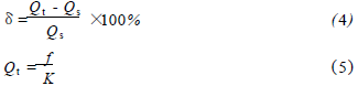 將過熱蒸汽流量計(jì)在標(biāo)準(zhǔn)水裝置上,分別用頻譜分析和脈沖計(jì)數(shù)的方法進(jìn)行標(biāo)定,流體介質(zhì)為水未加氣體,采用的標(biāo)準(zhǔn)傳感器為精度等級為0.2級的電磁流量計(jì)。在每個流量測量點(diǎn)上的儀表系數(shù)用公式(1)計(jì)算,然后用式(2)計(jì)算得到*終儀表系數(shù)K。Ql為被測水的流量值,f為每一個流量點(diǎn)得到的頻率,k為每個測量點(diǎn)得到的儀表系數(shù)。kmax、kmin分別為試驗(yàn)流量范圍內(nèi)得到的*大與*小的儀表系數(shù)。儀表系數(shù)的線性度E1用式(3)來計(jì)算。