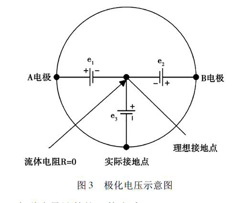 在被測液體與電極和接液部件接觸過程中,電解質(zhì)中的正負(fù)離子會(huì)分別作定向運(yùn)動(dòng),這會(huì)使被測液體在電極和接液部件之間形成電位差,通常將這種現(xiàn)象稱為極化現(xiàn)象。如圖3 所示,理論上來說,兩電極A 和B 對接液部件的電位e1、e2大小相等、方向相反,此時(shí)兩電極的電位差等于零。但是,若兩電極的材質(zhì)或表面狀態(tài)存在差異,此時(shí)A、B 電極之間的電位差就不為零,這就形成了極化電壓,極化電壓與共模狀態(tài)的電壓e3一起疊加在流量信號中,被輸入轉(zhuǎn)換器的差動(dòng)放大器。當(dāng)極化電壓過大,則會(huì)對差動(dòng)放大器的輸入端造成較大影響,導(dǎo)致信號無法放大或流量信號的輸出波動(dòng)過大,從而降低了衛(wèi)生型卡箍電磁流量計(jì)的測量精度。