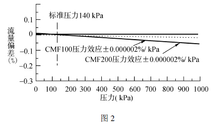 從圖2 中, 我們可以看出壓力對測量準(zhǔn)確度的影響:當(dāng)工藝壓力增大, 會使流量計(jì)產(chǎn)生一個(gè)負(fù)向偏差, 表現(xiàn)為流量顯示值比實(shí)際值偏小;當(dāng)壓力減小時(shí), 會使流量計(jì)產(chǎn)生一個(gè)正向偏差, 表現(xiàn)為流量顯示值比實(shí)際值偏大。