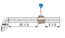 若傳感器安裝點的上游在同一平面上有二個90°彎頭,傳感器上游應(yīng)有不小于25D的等徑直管段,下游應(yīng)有不小于5D的等徑直管段。