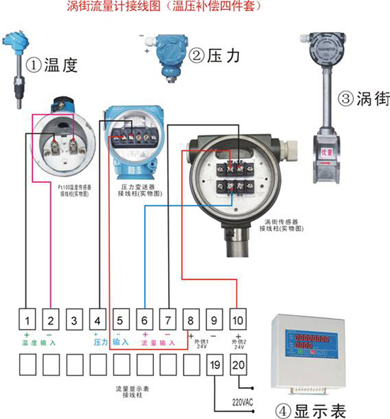 帶RS-485通訊功能的渦街流量計(jì)采用DC24V電源供電,與其它設(shè)備之間采用四線制傳輸方式。儀表端子接線見圖
