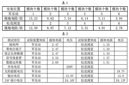 接地網(wǎng)的安裝與連接:接地網(wǎng)是整個(gè)色拉油流量計(jì)防雷試驗(yàn)比較關(guān)鍵的一個(gè)內(nèi)容,能不能準(zhǔn)確的論證試驗(yàn)的有效性,必須保證接地網(wǎng)達(dá)到標(biāo)準(zhǔn)的接地電阻,通過對(duì)實(shí)地地電阻率的測(cè)試,初步選擇6個(gè)接地模塊埋設(shè)并配用降阻劑使用,邊安裝邊測(cè)試直到達(dá)到標(biāo)準(zhǔn)值后才引入等電位箱。在軍樂站和松花閥室安裝模塊并測(cè)試數(shù)據(jù)見表1。