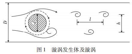 氮?dú)饬髁坑?jì)是由漩渦發(fā)生體、頻率檢測器和信號轉(zhuǎn)換器等環(huán)節(jié)組成,輸出 4 ~ 20 mADC 信號或脈沖電壓信號。其測量原理是在流動的流體中的垂直流動方向安放 1 根或多根非流體型阻流體,在一定的流量范圍內(nèi),流體在阻流體兩側(cè)交替地分離、釋放出 2 串頻率正比于管道內(nèi)的平均流速、規(guī)則的、不對稱有規(guī)律的交替漩渦列,如圖 1 所示,且兩側(cè)漩渦旋轉(zhuǎn)方向相反。采用檢測元件測出漩渦頻率就可以推算出流體的流量。