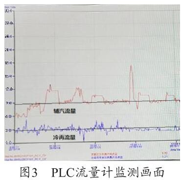 通過圖3可以看出,PLC 上輔汽測(cè)量用的煙氣流量計(jì)的量程設(shè)置為30t/h,現(xiàn)場(chǎng)設(shè)備量程實(shí)際為5t/h,兩者嚴(yán)重不符,因此測(cè)量值8.286t/h 為錯(cuò)誤值,需要對(duì)程序進(jìn)行修改。