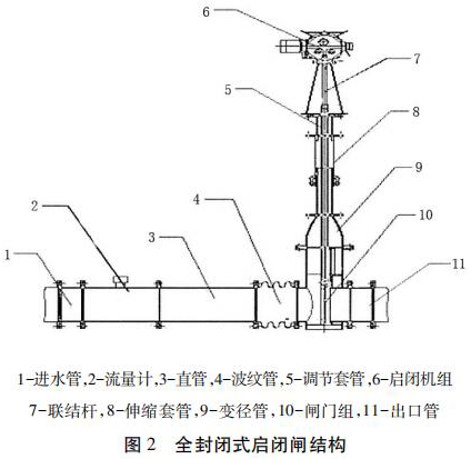 包括進(jìn)水管、直管、出水管、過(guò)熱蒸汽流量計(jì)組和啟閉機(jī)組,進(jìn)水管、直管、出水管從左到右依次連接,過(guò)熱蒸汽流量計(jì)組安裝在直管和出水管之間且位于出水管的入口處,過(guò)熱蒸汽流量計(jì)組通過(guò)聯(lián)結(jié)桿與啟閉機(jī)組的輸出端連接。為防止泥沙淤積影響啟閉,過(guò)熱蒸汽流量計(jì)采用閘板式啟閉結(jié)構(gòu)。密封式啟閉閘為整體封閉管道式,全部采用不銹鋼材料,水流通過(guò)管道流出讓整個(gè)閘井內(nèi)干燥無(wú)水。伸縮套管與波紋管的設(shè)計(jì)讓檢修與清理淤泥更加方便。過(guò)熱蒸汽流量計(jì)裝有荷載限制器,其布置受力明確、結(jié)構(gòu)緊湊、動(dòng)作可靠。當(dāng)?shù)蹙呱系暮奢d達(dá)到額定值的 110%時(shí),或電機(jī)電流超過(guò)額定電流 150%時(shí),系統(tǒng)自動(dòng)切斷操作電源以保護(hù)設(shè)備安全。
