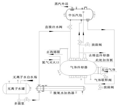來自無離子水罐的脫氧水經(jīng)多經(jīng)泵加壓、經(jīng)脫氧水加熱器加熱后進入到煤氣流量計的水段,脫氧水與反應(yīng)氣體換熱后分兩路:一路進入中壓汽包,保證汽包有穩(wěn)定的液位;一路進入熔鹽冷卻器帶出熔鹽攜帶的反應(yīng)熱。來自中壓汽包的高溫水經(jīng)管路接至煤氣流量計汽段底部,高溫水與反應(yīng)氣體換熱后產(chǎn)生高壓蒸汽,高壓蒸汽又返回中壓汽包。汽包還有一路直接注水管路,此路水不經(jīng)過煤氣流量計水段,而是直接進入汽包。在煤氣流量計出口溫度偏低而汽包液位也比較低時,可開此直接注水管路來穩(wěn)定汽包液位。其詳細流程圖如圖 2。