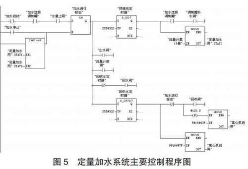 (2)程序設(shè)計(jì)。儲水罐水量控制的工作過程為:當(dāng)壓力變送器檢測到儲水罐的水量低于 450kg 時(shí),補(bǔ)水閥 3 開啟為儲水罐補(bǔ)水;當(dāng)水量達(dá)到 490kg 時(shí),補(bǔ)水閥 3 關(guān)閉;生產(chǎn)配制過程中,循環(huán)以上控制過程。儲水罐水量控制的程序如圖 4 所示。