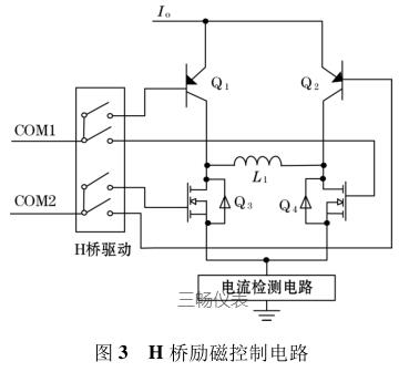高頻勵磁電路主要由高低壓切換恒流控制電路和H 橋勵磁開關(guān)電路組成。其中高低壓切換恒流控制電路確保高壓或低壓情況,都可以通過 H 橋向勵磁線圈提供恒定的電流。電路原理圖如圖 2所示。