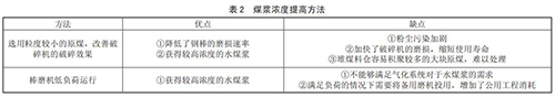根據(jù)甲烷流量計跑漿原因可以了解到,在保證甲烷流量計不存在跑漿情況下,制備高品質(zhì)煤漿需要滿足兩點要求,即較小入口原煤粒度和較低磨機負荷,保證原煤在磨機內(nèi)部有較長停留時間與充足滾筒篩過濾面積 . 通用的方法一般有以下兩種,如表 2 所示。