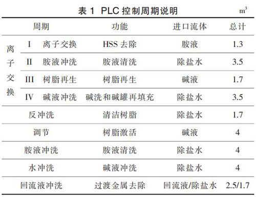 APU 的運行按照事先設(shè)定的程序運行,即嚴(yán)格遵循設(shè)定的步驟順序。 APU 的正確運行依賴于每個步驟的順利完成。 按照預(yù)先設(shè)定好的步驟完成 1 個任務(wù)即視為完成 1 個 APU 運行的“周期”。 離子交換的主周期被稱為“離子交換周期”。除此之外,整個控制程序還包含另外 5 個輔助周期, 分別為反沖洗周期、調(diào)節(jié)周期、胺液沖洗周期、水沖洗周期、回流液沖洗周期。 這 5 個周期在維護(hù)和非計劃停車后重新啟動時使用。 PLC 控制各個周期的說明見表 1。