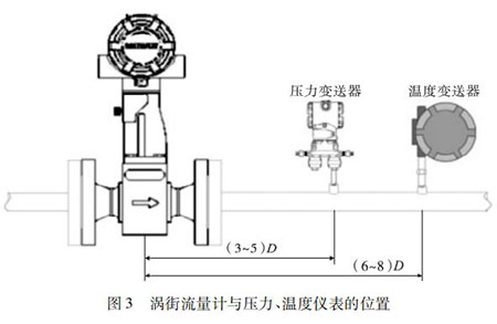 氫氣流量計(jì)的口徑如果與工藝管道相同,不能滿足流量?jī)x表要求時(shí),或者在此流速下測(cè)量準(zhǔn)確度不能保證時(shí),需要縮小儀表口徑,從而提高管內(nèi)流速,保證測(cè)量精度。上下游必須有足夠的直管段,若傳感器安裝點(diǎn)的上游在同一平面上有 2 個(gè) 90°彎頭時(shí),上游直管段≥25D,下游直管段≥5D。根據(jù)測(cè)量的需要,需在氫氣流量計(jì)附近測(cè)量壓力和溫度時(shí),測(cè)壓點(diǎn)應(yīng)在傳感器下游的( 3 ~ 5) D 處,測(cè)溫點(diǎn)應(yīng)在傳感器下游的( 6 ~ 8) D 處,如圖 3 所示。