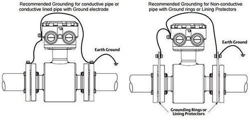 法蘭式流量管:當(dāng)法蘭式流量管安裝在非金屬,塑料,PVC或襯里的工藝管道之間時(shí),SG必須通過除工藝管道法蘭螺栓之外的其他路徑。在這種安裝方案中,需要接地環(huán)或接地電極(圖6)。