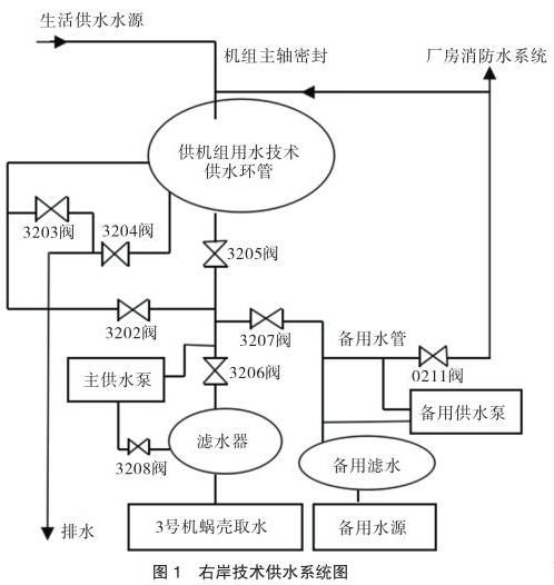技術(shù)供水系統(tǒng)設(shè)有主、備用水源。主水源是蝸殼取水,作為機(jī)組技術(shù)供水的主用水源。備用水源有兩個(gè),一個(gè)是設(shè)在 1 號(hào)機(jī)段的壩前取水,取水口高程為 145m,另一個(gè)是同 4 號(hào)機(jī)組蝸殼取水共用取水口的蝸殼備用取水。兩路備用水源均接到備用總水管,并通過(guò) X207 閥分別與各臺(tái)機(jī)組的技術(shù)供水系統(tǒng)相連通(見圖 2)。