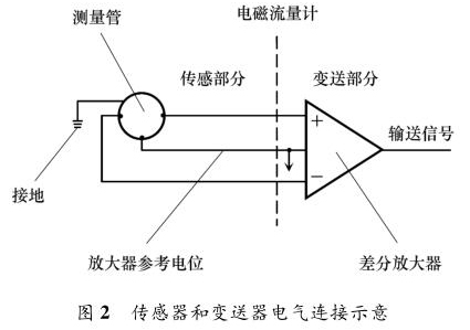 防腐型電磁流量計主要由兩部分組成:流量傳感器和信號變送器,如圖 2 所示。傳感器上的勵磁線圈接受變送器傳輸來的勵磁電流產(chǎn)生磁場,輸出感應(yīng)電動勢信號;信號變送器則將感應(yīng)電動勢信號轉(zhuǎn)換為流量信號或模擬量信號送至控制系統(tǒng)。防腐型電磁流量計按組成方式分為一體式和分體式。防腐型電磁流量計穩(wěn)定工作另外一個重要條件是接地。當(dāng)流體流動穿過磁場時,以導(dǎo)電流體本身作為參考電位,在測量管一側(cè)電極產(chǎn)生正電勢,另一側(cè)產(chǎn)生負(fù)電勢,形成電勢差。但此電動勢信號一般只有幾毫伏,易受外界干擾。為防止干擾,將參考電位接入大地作為零電位,保證傳感器輸出精確穩(wěn)定的信號。傳感器和轉(zhuǎn)換器的接地端必須與被測介質(zhì)同電位,才能構(gòu)成對稱的輸入輸出回路。