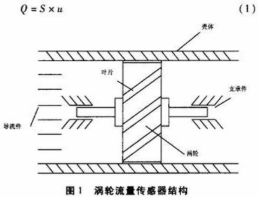 渦輪流量傳感器結(jié)構(gòu)如圖1所示,屬于速度式流量傳感器。渦輪置于流體通道中,隨著流體的流動產(chǎn)生旋轉(zhuǎn),設(shè)渦輪的轉(zhuǎn)速為n、流過渦輪的流體速度為u,則n與u成正比;流體通道的流通截面.積S是已知的常數(shù),所以,流過渦輪流量傳感器的流體體積流量Q為: