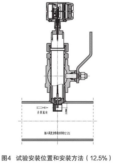 根據(jù)中華人民共和國機(jī)械行業(yè)標(biāo)準(zhǔn):JB/T9249-2015《煙氣流量計(jì)》進(jìn)行氣體渦輪流量計(jì)的研制與設(shè)計(jì)。在試驗(yàn)過程中,因?yàn)槔碚撗芯坎怀浞?,再加上?jīng)驗(yàn)不足,采用插入深度是按照以往其它產(chǎn)品(插入式電磁流量計(jì))的經(jīng)驗(yàn),以插入深度為現(xiàn)場管道內(nèi)徑的 12.5% 進(jìn)行試驗(yàn),其對介質(zhì)流量的檢測值與同種規(guī)格管道法蘭式結(jié)構(gòu)的煙氣流量計(jì)進(jìn)行比較,偏差值較大、儀表準(zhǔn)確度無法滿足設(shè)計(jì)要求。試驗(yàn)安裝位置和安裝方法如圖 4 所示。