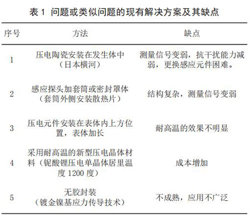 3) 當(dāng)前技術(shù)系統(tǒng)存在的問題。 由于目前使用的傳感器檢測(cè)感應(yīng)元件為壓電陶瓷,其極化時(shí)居里溫度大約420 ~ 460℃,因此只能在低于 240℃介質(zhì)中使用,一旦被測(cè)量介質(zhì)的溫度高于 240℃,煤氣流量計(jì)傳感器便會(huì)因壓電陶瓷達(dá)到居里點(diǎn),絕緣電阻降低,壓電信號(hào)變?nèi)醵А?br /> 4)問題或類似問題的現(xiàn)有解決方案及其缺點(diǎn)(見表 1)。