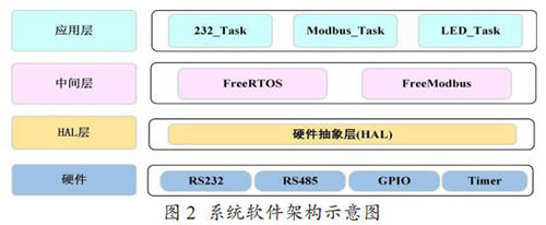 Modbus 通訊模塊的軟件架構如圖 2 所示,分為硬件層、硬件抽象層,中間層和應用層。中間層包括一個實時操作系統(tǒng)FreeRTOS 和一個針對嵌入式環(huán)境開發(fā)的輕量級 Modbus 協議庫Freemodbus。在應用層,主要創(chuàng)建了三個任務,232_Task 負責讀 取和解析流量計表頭輸出的文本信息,Modbus_Task 負責存儲 解析后的流量計數據到 Modbus 寄存器表,以及以 Modbus 協議與取水監(jiān)測設備通信,LED_Task 是一個輔助任務,主要用來提示程序運行狀態(tài)。