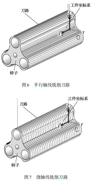 三葉轉(zhuǎn)子的曲面是由多條直線組成的直紋面,加工三葉轉(zhuǎn)子這種高精度的直紋曲面必須采用四軸或五軸聯(lián)動的數(shù)控機(jī)床。三葉轉(zhuǎn)子的銑削方式有刀具路徑平行軸線銑削、繞軸線銑削兩種刀具路徑。平行軸線銑削原理為: 刀具在轉(zhuǎn)子曲面上沿 X軸從轉(zhuǎn)子的一端移動到另一端銑出一條直線,銑削下一點(diǎn)位時旋轉(zhuǎn) A 軸 Z 軸聯(lián)動再次從轉(zhuǎn)子一端銑削到另一端,采用往復(fù)銑削直到完成整個轉(zhuǎn)子曲面,刀具路徑如圖 6 所示。繞軸線銑削原理為: 刀具在轉(zhuǎn)子曲面上 AZ 軸聯(lián)動刀具繞 A 軸軸線銑削,銑削下一點(diǎn)位時移動 X 軸,再次 AZ 軸進(jìn)行聯(lián)動銑削,采用往復(fù)銑削直到完成整個轉(zhuǎn)子曲面,刀具路徑如圖 7 所示。由于繞軸銑削需要 AZ 軸聯(lián)動切削,而數(shù)控機(jī)床可以達(dá)到的進(jìn)給率是由*慢的軸決定的,所以,這種刀具路徑在精加工高速銑削時并不適用。