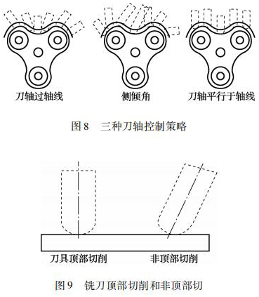 四軸加工中采用球頭銑刀,刀軸控制策略是提高加工效率和轉(zhuǎn)子曲面表面粗糙度的關(guān)鍵。如圖 8所示,刀軸控制策略有常見的刀軸過軸線、側(cè)傾角、刀軸平行于軸線。筆者采用平行軸線銑削加工方式對這 3 種刀軸控制策略進(jìn)行實(shí)際加工對比,得出采用側(cè)傾角刀軸控制策略加工出的轉(zhuǎn)子曲面表面粗糙度*好。其原因主要由于刀軸平行于軸線這種刀軸控制策略采用球頭銑刀加工時,其刀具切削轉(zhuǎn)子曲面時的接觸點(diǎn)為刀具的頂部,球頭銑刀的頂部直徑為零,線速度也為零。此時刀具是在擠壓工件,刀具頂部也容易磨損。刀軸過軸線策略雖然刀具與轉(zhuǎn)子曲面的接觸點(diǎn)一直在變換,但是也有刀位點(diǎn)是采用刀具頂部去切削。側(cè)前傾角刀軸控制策略: 控制刀具與轉(zhuǎn)子曲面接觸點(diǎn)的位置,避免球頭銑刀頂部銑削轉(zhuǎn)子曲面,實(shí)現(xiàn)刀尖的點(diǎn)的偏離,提高刀具切削點(diǎn)的線速度。球頭銑刀頂部切削和非頂部切削如圖 9 所示。