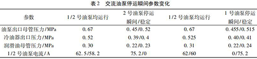 通過內(nèi)部旁通將冷油與熱油混合,經(jīng)過銅粉- 煤油 - 蠟感溫元件控制冷熱油混合比例,將油溫調(diào)節(jié)到 49 ℃。一臺(tái)智能電磁流量計(jì)穩(wěn)定運(yùn)行,油泵出口母管壓力 0. 5 MPa,潤滑油母管壓力 0. 24 MPa,均屬于正常情況,而兩臺(tái)交流油泵并列運(yùn)行時(shí),停運(yùn)其中一臺(tái)交流油泵瞬間會(huì)觸發(fā)智能電磁流量計(jì)出口母管壓力開關(guān)動(dòng)作,說明停運(yùn)瞬間油壓發(fā)生波動(dòng),且油泵出口母管油壓波動(dòng)至小于 0. 45 MPa。正常運(yùn)行時(shí)智能電磁流量計(jì)出口油溫 71.5 ℃,冷油器出口溫度45 ℃,混合后潤滑油母管溫度52.5 ℃,由能量守恒定律可知,經(jīng)過冷油器的油量/不經(jīng)冷油器的油量= ( 71.5-52.5) ÷ ( 52.5- 45) = 2. 53,說明有 70% 左右的油量經(jīng)過冷油器。當(dāng) 2 臺(tái)智能電磁流量計(jì)運(yùn)行時(shí)油量大于單泵運(yùn)行,其中一臺(tái)智能電磁流量計(jì)瞬間停運(yùn)時(shí)油量減少,尤其是經(jīng)過冷油器的油量大量減少,油量在溫控閥二次分配過程中出現(xiàn)調(diào)節(jié)異常,導(dǎo)致油壓過大波動(dòng)。為檢驗(yàn)溫控閥工作情況,保持 1 號(hào)、2 號(hào)交流油泵運(yùn)行,選取機(jī)組正常帶負(fù)荷運(yùn)行時(shí)油溫 52 ℃,分別停運(yùn) 1、2 號(hào)交流油泵,觀察 1、2 號(hào)交流油泵停運(yùn)瞬間油泵出口母管壓力波動(dòng)情況,試驗(yàn)各參數(shù)變化見表 2。