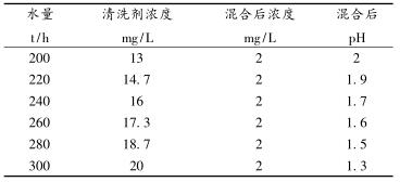 (2)加酸期間附企水處理公司人員負責每0.5h在高架水槽處化驗污環(huán)水pH值,每2h監(jiān)測一次高架水槽內(nèi)掛片腐蝕情況,將化驗結(jié)果告知燃氣崗位人員,崗位職工負責記錄。當pH小于6時,附企給水人員在高架水槽處加入堿液進行調(diào)整,同時根據(jù)洗滌塔循環(huán)水量變換情況調(diào)整清洗劑濃度見表3。