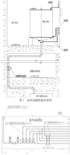 透平油油庫及油處理室設(shè)置在發(fā)電機(jī)出線層。油庫中安裝4個油桶,單個油桶容積為25m3。按照功能劃分為2個運(yùn)行油桶,2個凈油桶。每個油桶ding部設(shè)置一根油桶進(jìn)油管,油桶下部設(shè)置一根給機(jī)組供油管,油桶底部設(shè)置一根事故排油管,經(jīng)事故排油閥引入事故油池中,事故排油管上引出一根油桶排油管。各油桶的進(jìn)油管、供油管、排油管分別引入油處理室中。具體布置形式可見圖1所示。油處理室中設(shè)置一個容積為1m3的移動油箱,用于向設(shè)備添油或臨時儲油。