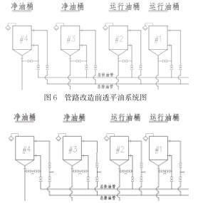(1)改造后,各個油桶的油處理工作實現(xiàn)互不影響的效果。油桶排油支管的臨時接口兩端的球閥都是近油桶側(cè)的閥門,油桶進(jìn)油支管的臨時接口ding部的球閥為近油桶側(cè)的閥門。油桶需進(jìn)行油過濾工作時,僅需將濾油機(jī)的進(jìn)油管接在該油桶排油支管新增的臨時接口上,同時濾油機(jī)的出油管連接在該油桶進(jìn)油支管新增的臨時接口上,然后分別打開進(jìn)油支管和排油支管新增臨時接口ding部的近油桶側(cè)球閥,即可開始形成循環(huán)油路進(jìn)行油桶內(nèi)的透平油過濾。同時未改變各個油桶中透平油的互相倒換、轉(zhuǎn)移功能。