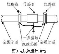 (4)盡量避開振動(dòng)源、磁源(大功率電機(jī)、變壓器)由于dn200電磁流量計(jì)的測(cè)量感應(yīng)電壓很小,電壓較低,易受外界電磁噪聲的影響,故在安裝時(shí)應(yīng)進(jìn)行可靠的接地連(跨)接。金屬管道dn200電磁流量計(jì)接地連(跨)接方法如圖3所示