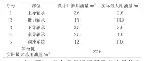 由表1可知,單臺(tái)機(jī)組運(yùn)行所需總油量約為37.6m3,其中各軸承所需油量約為24m3,均超出設(shè)計(jì)計(jì)算總油量。機(jī)組運(yùn)行所需總油量超出一個(gè)運(yùn)行油桶的總?cè)莘e,至少需用2個(gè)油桶來(lái)盛放。為保證機(jī)組各軸承用油和調(diào)速系統(tǒng)用油的油品質(zhì)量,機(jī)組排油時(shí)將各軸承所用透平油(約為24m3)排至一個(gè)運(yùn)行油桶中,將調(diào)速系統(tǒng)所用透平油(約為13.6m3)排至另一個(gè)運(yùn)行油桶中,避免混合造成油質(zhì)化驗(yàn)指標(biāo)不滿(mǎn)足用油設(shè)備的要求。