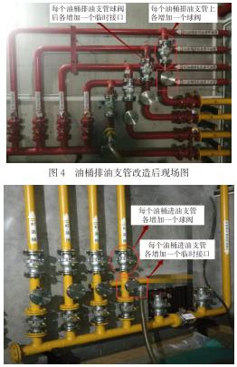 (3)改造后,油庫(kù)中各個(gè)油桶的透平油在處理過(guò)程中,發(fā)生竄油至機(jī)組透平油供油、回油總管和各臺(tái)機(jī)機(jī)組段供排油管網(wǎng)的概率大大降低,保證其他非檢修機(jī)組及運(yùn)行設(shè)備的安全。改造前,進(jìn)行油處理時(shí)油流必須流經(jīng)油處理室中的機(jī)組透平油供油和回油總管,而油處理室中的機(jī)組透平油供油和回油總管與縱貫全廠(chǎng)的機(jī)組供、排油兩根干管僅有一個(gè)球閥進(jìn)行截止,該閥門(mén)如果操作失誤未關(guān)閉或關(guān)閉不嚴(yán)密等異常情況,必然造成竄油至機(jī)組透平油供油、回油總管和各臺(tái)機(jī)機(jī)組段供排油管網(wǎng),引發(fā)不安全事件。改造后,進(jìn)行油處理時(shí),油流僅流經(jīng)支管,支管和總管之間有一個(gè)球閥截止,總管與干管還有一個(gè)球閥截止,多了一道防護(hù),極大提高了設(shè)備的可靠性。