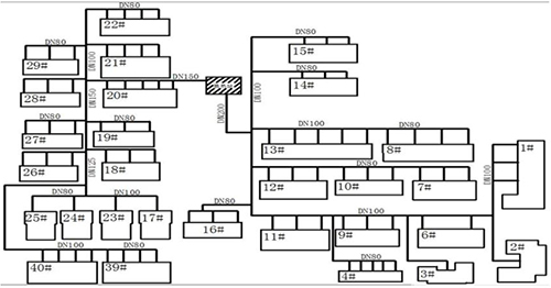 某小區(qū)住宅樓建設(shè)于1996年,建筑結(jié)構(gòu)為磚混建筑,建筑面積為54931m2,共30棟住宅樓。2017年繳費(fèi)739戶,總采暖面積為47141m2。換熱站位于小區(qū)中部,板式換熱機(jī)組設(shè)計(jì)換熱面積為50000m2,循環(huán)泵額定功率為30kW,流量為200m³/h,揚(yáng)程為32m。庭院管網(wǎng)共分為2個(gè)支狀供回水環(huán)路,該小區(qū)供熱管網(wǎng)見(jiàn)圖1所示。