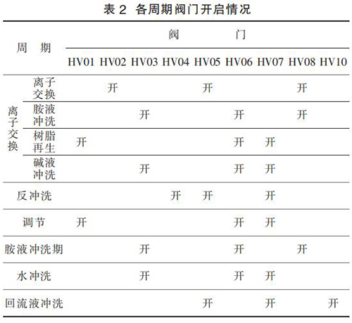 5)回流沖洗周期。 胺液每天都需取樣化驗,如果發(fā)現(xiàn)胺液中有不溶或懸浮的過渡金屬聚集,則每天運行周期結(jié)束后需利用回流液對樹脂進行清洗,以防止腐蝕和樹脂損壞。 如果選擇了此選項,PLC程序會在每天完成目標數(shù)量的離子交換周期后,自動執(zhí)行回流液清洗周期。 各周期閥門對應(yīng)開關(guān)情況,如表 2 所示。