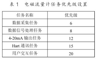 下面以電磁流量計為例說明基于  μC/OS-III 的人機界面設(shè)計。 先將  μC/OS-III 移植到 Cortex-M3 處理器上,這里選用的是 STM32F103VET6 。電磁流量計的應用程序若按照上節(jié)的任務種類劃分有: 數(shù)據(jù)采集任務、數(shù)據(jù)處理任務, 4~20mA輸出任務, Hart 通訊任務以及用戶交互任務。 先對不同的任務進行優(yōu)先級的劃分,如表 1 所示。