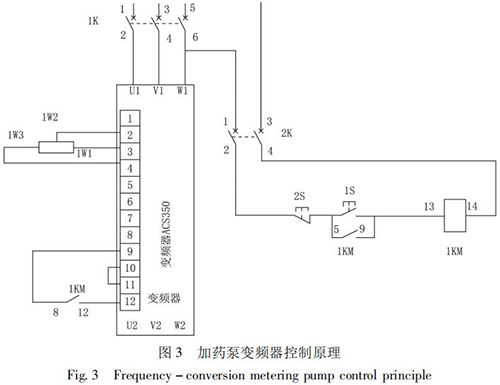 STD - Ⅲ型浮選工藝參數(shù)自動(dòng)測(cè)控系統(tǒng)通過(guò)雙膜盒差壓計(jì)測(cè)量原礦漿濃度; 采用工業(yè)水流量計(jì)測(cè)量原礦漿流量,由 PLC 計(jì)算出入浮干煤泥量和藥劑的瞬時(shí)添加量,用變頻式計(jì)量泵完成浮選藥劑的添加。通過(guò)上位機(jī)還可以打印小時(shí)、班、天及月的運(yùn)行數(shù)據(jù),更加有利于生產(chǎn)管理及技術(shù)分析,藥劑自動(dòng)原理如圖 2 所示,k1、k2、k3 是計(jì)算修正參數(shù)。以 PID 算法為核心,通過(guò)優(yōu)化控制程序計(jì)算出藥劑給定量,在捕收劑和起泡劑管道上分別安裝藥劑測(cè)量裝置,用于檢測(cè)藥劑的添加量。當(dāng)藥劑測(cè)量值小于藥劑給定量時(shí),PID 輸出增大,反之則減小。加藥泵變頻器控制原理如圖 3 所示。