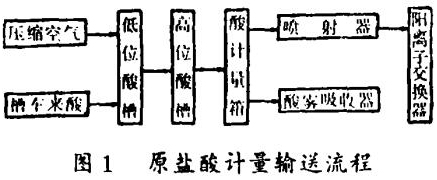 用陽離子交換樹脂制水要用酸作為再生劑。國內(nèi)電廠多選用鹽酸。鹽酸用傳統(tǒng)的箱式計量方法,使系統(tǒng)操作復雜,安全性能降低,還會嚴重污染環(huán)境。一種用工業(yè)用水流量計代替鹽酸計量箱的負壓輸送鹽酸系統(tǒng)能克服上述缺點。該系統(tǒng)自運行以來,使用情況良好,維護方便,受到工人們的歡迎。