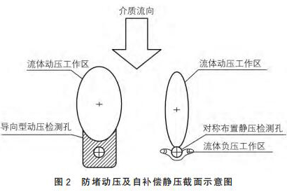 新衛(wèi)生渦輪流量計(jì)采用拋物面導(dǎo)向型結(jié)構(gòu)作為動(dòng)壓測(cè)點(diǎn),采用對(duì)稱自補(bǔ)償型式的靜壓測(cè)點(diǎn),可以有效地解決來(lái)流方向偏流時(shí)信號(hào)的穩(wěn)定采集,來(lái)流偏離管道軸線時(shí),可以維持輸出差壓基本不變,如圖2所示。